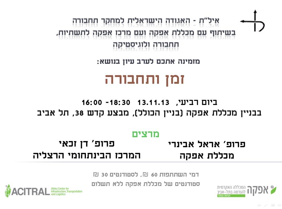 ערב עיון בנושא זמן ותחבורה - אגודת איל"ת בשיתוף מכללת אפקהערב העיון יתקיים ביום רביעי 13.11.2013 בשעה 16:00, בבניין מכללת אפקה – רחוב מבצע קדש 38 ת"א – מבנה "הכולל" (גישה מגינת המתחם). לפרטים נוספים ומפת הגעה. הרשמה בכניסה לאירוע. במסגרת ערב העיון יינתנו שתי הרצאות: