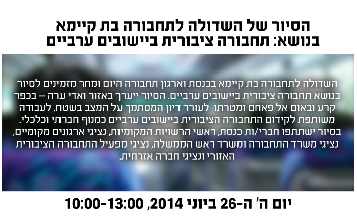 תחבורה ציבורית ביישובים ערביים: סיור לשדולה לתחבורה בת קיימאח"כ תמר זנדברג - יו"ר משותף של השדולה לתחבורה בת קיימא בכנסת, וארגון תחבורה היום ומחר יערכו ביום ה' ה-26 ביוני 2014 סיור באזור ואדי ערה. מטרת הסיור לעורר דיון המסתמך על המצב בשטח, לעבודה משותפת לקידום התחבורה הציבורית ביישובים ערביים כמנוף חברתי וכלכלי. הסוגיות לדיון: קידום תחבורה ציבורית ביישובים ערביים אשר אין בהם עדיין כל שירות, הרחבת היקפי השירות המצומצמים ביישובים אחרים, הסדרת מסופים לתחבורה ציבורית ותשתיות כבישים, מדרכות ותחנות, הקצאת קרקעות לתשתיות תחבורה, הפעלת תחבורה ציבורית בשבתות וחגי ישראל, והקצאת תקציבים. ראו כאן סדר היום של הסיור. בסיור ישתתפו חברי כנסת, ראשי הרשויות המקומיות, נציגי ארגונים מקומיים, נציגי משרד התחבורה ומשרד ראש הממשלה, נציגי מפעיל התחבורה הציבורית האזורי ונציגי חברה אזרחית. לפרטים נוספים: תמר קינן, תחבורה היום ומחר tamar@transportation.org.il