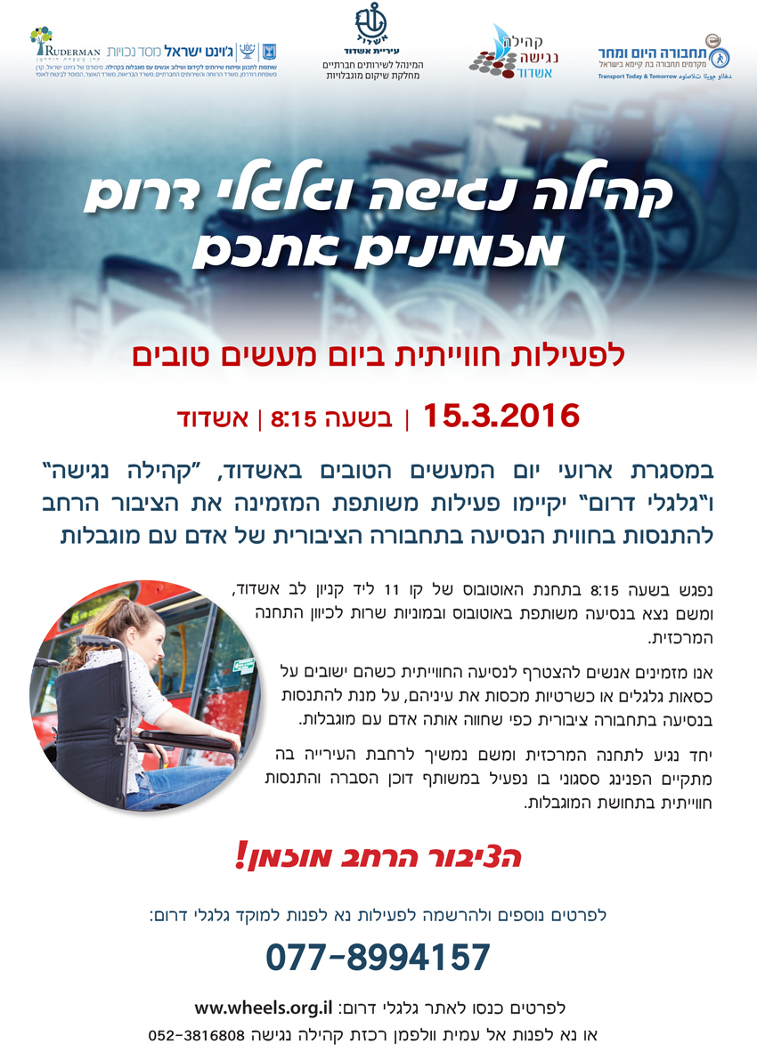 תוכנית "גלגלי צפון ודרום" תקל על אנשים עם מוגבלויות שאינם יכולים להתנייד בעצמם לעשות שימוש בתחבורה ציבורית וכך לפתוח בפניהם אפשרויות חדשות בתחומי העבודה, הבילוי והפנאי והקשר עם ידידים וקרובי משפחה. התוכנית פועלת בשיתוף פעולה של מסד נכויות-ג'וינט ישראל ועמותת "תחבורה היום ומחר", המקדמת תחבורה בת-קיימא בישראל.