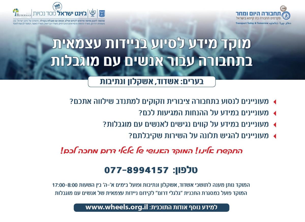 תוכנית גלגלי דרום של מסד נכויות (מיסודם של ג'וינט ישראל, ממשלת ישראל וקרן משפחת רודרמן), הקרן למפעלים מיוחדים של הביטוח הלאומי, ותחבורה היום ומחר נועדה לקדם את יכולת ההתניידות העצמאית של אנשים עם מוגבלויות מכל הסוגים, על מנת לאפשר להם חיים עצמאיים והשתלבות בקהילה.
