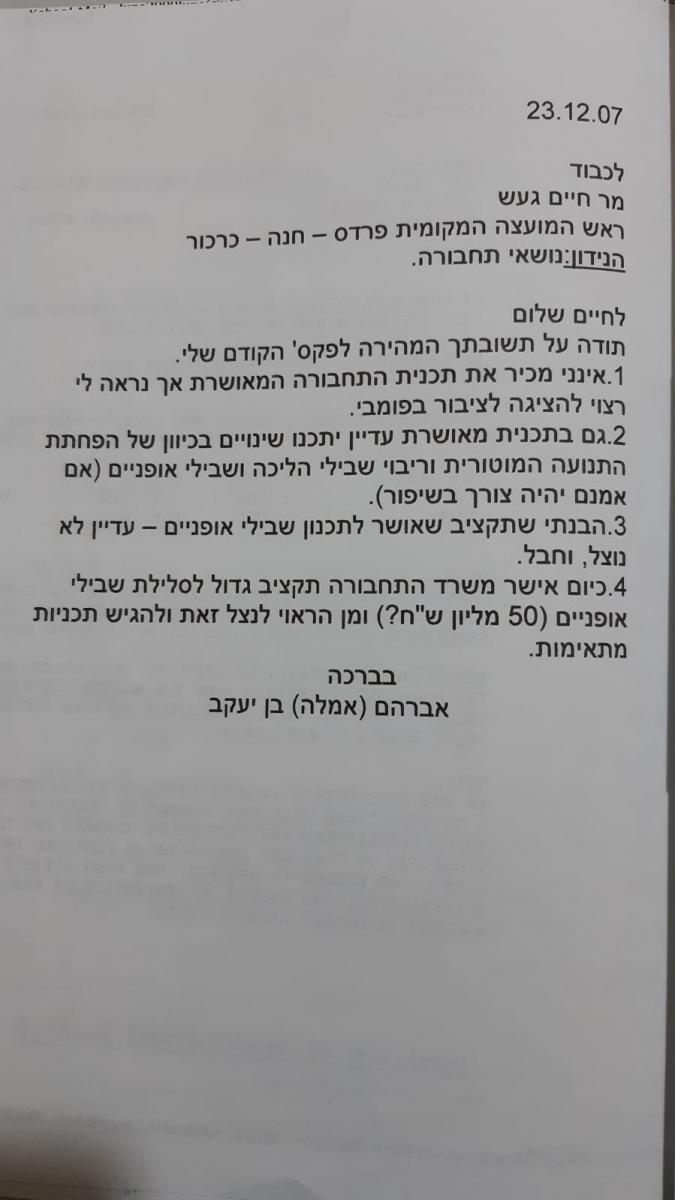 מכתב המשך לחיים געש - ראש מועצת פרדס חנה כרכור בנושא תכנון תחבורה בפרדס חנה