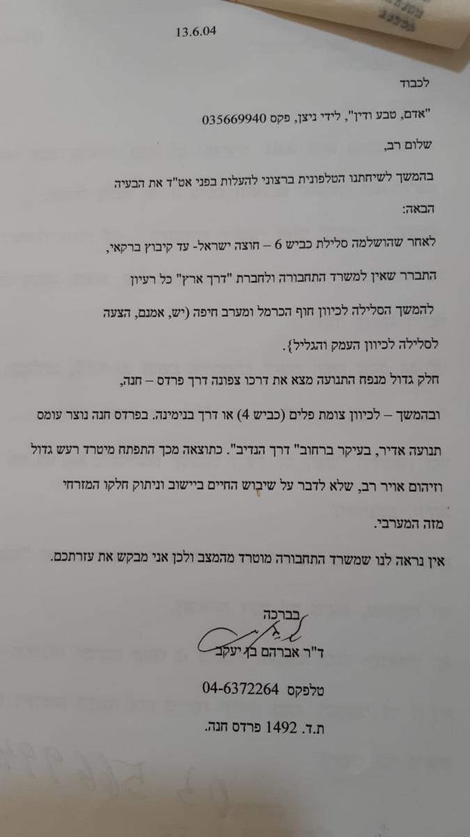 מכתב לאט"ד: עומס בפרדס חנה בעקבות בניית כביש 6
