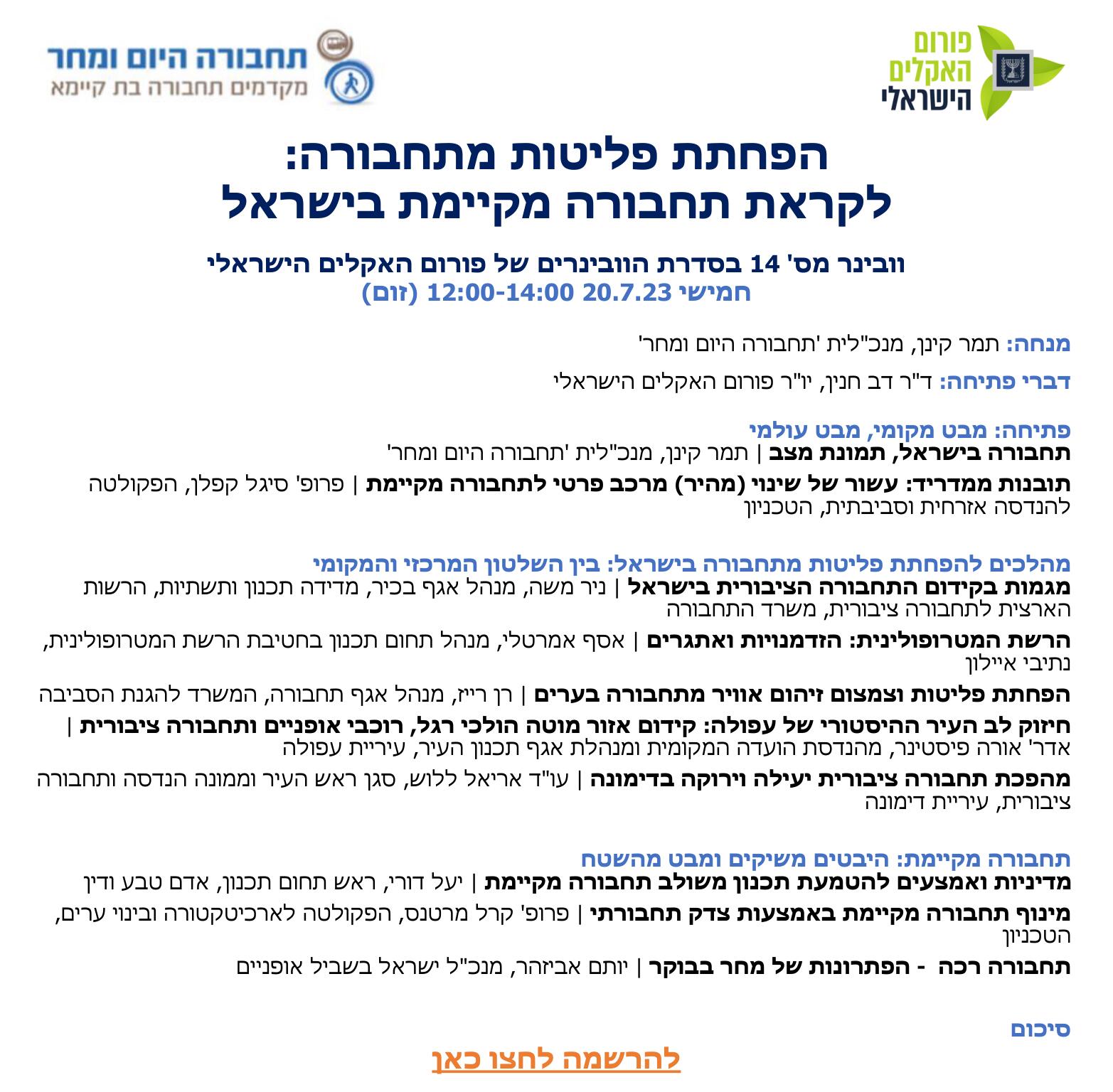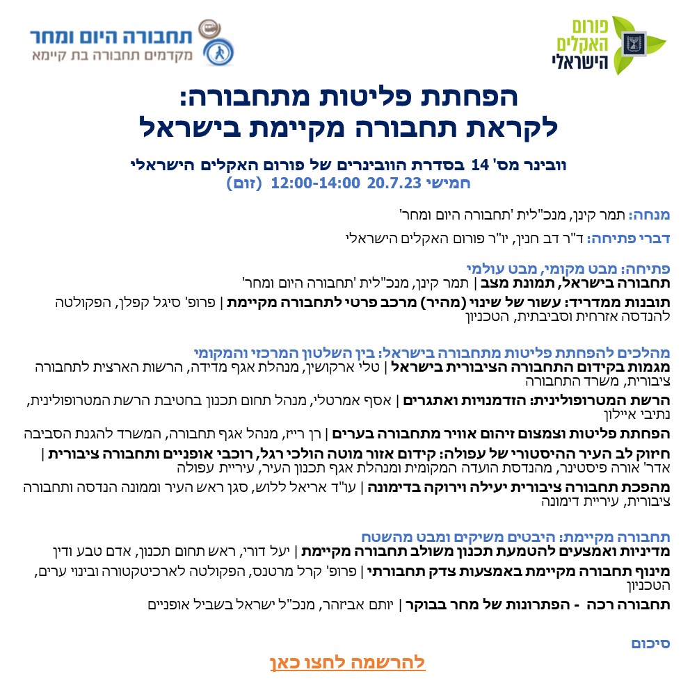 פורום האקלים הישראלי ו'תחבורה היום ומחר' מזמינים אתכן.ם לוובינר בנושא: *הפחתת פליטות מתחבורה: לקראת תחבורה מקיימת בישראל*.