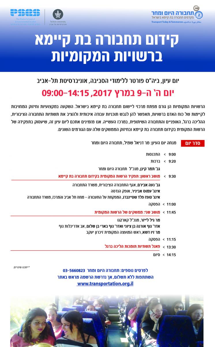 הרשויות המקומיות הן גורם מפתח מרכזי ליישום תחבורה בת קיימא בישראל. השקעה במקצועיות וחיזוק המחויבות לקיימות של כוח האדם ברשויות, תאפשר להן לגבש תוכניות עבודה איכותית ולהציב את תשתיות התחבורה הציבורית, ההליכה ברגל, האופניים והתחבורה השיתופית, במרכז העשייה. אנו מזמינים אתכם ליום עיון זה, שיעסוק בתפקידה של הרשות המקומית בקידום תחבורה בת קיימא ובחיזוק הממשקים שלה עם הגורמים השונים.