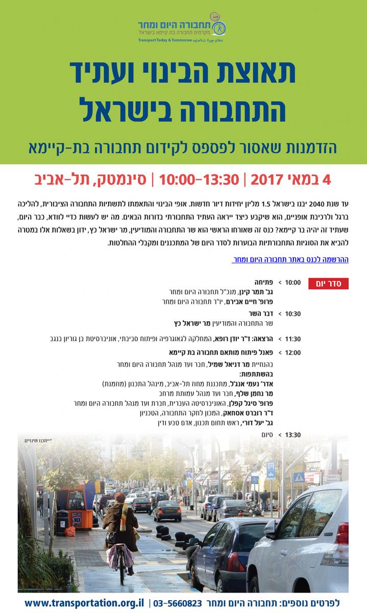 עד שנת 2040 יבנו בישראל 1.5 מליון יחידות דיור חדשות. אופי הבינוי והתאמתו לתשתיות התחבורה הציבורית, להליכה ברגל ולרכיבת אופניים, הוא שיקבע כיצד ייראה העתיד התחבורתי בדורות הבאים. מה יש לעשות כדיי לוודא, כבר היום, שעתיד זה יהיה בר קיימא? כנס זה שאורחו הראשי הוא שר התחבורה והבטיחות בדרכים, מר ישראל כץ, ידון בשאלות אלו במטרה להביא את הסוגיות התחבורתיות הבוערות לסדר היום של המתכננים ומקבלי ההחלטות.