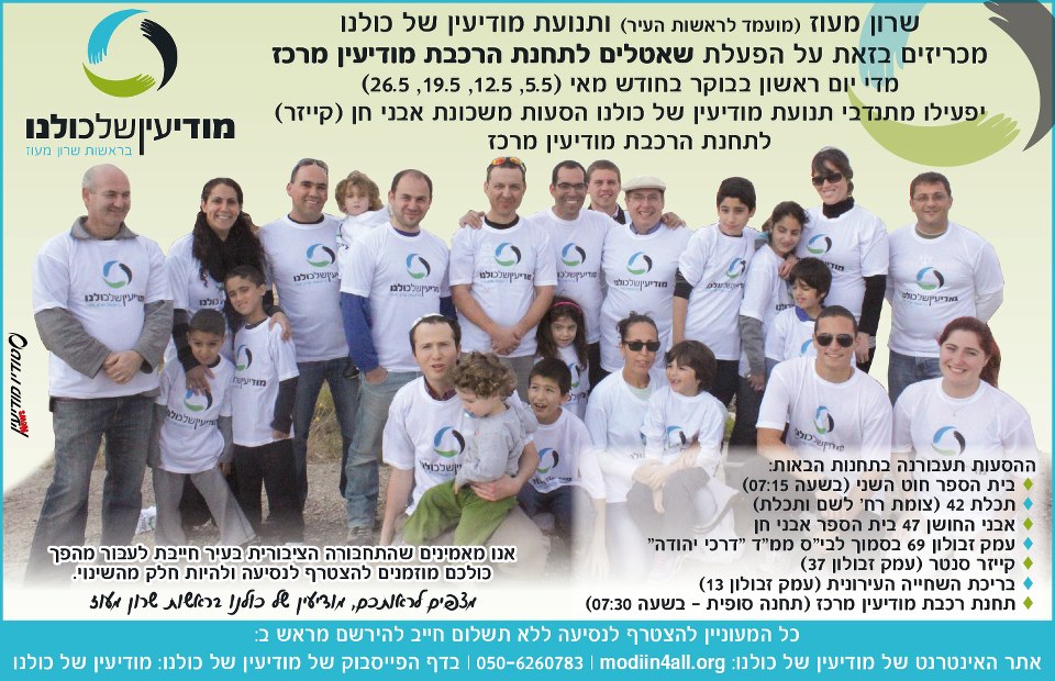 The movement "Modiin 4 all" is promoting civic involvement by the community in the city. Some of the movement members contacted us for help. The group is now promoting a pilot of shuttles between the train station and the city. The upcoming activities of the group will be: professional training for the activists; arranging a public event issuing the new PT operator ("Kavim") entrance to the Modiin area in purpose of commencing a dialogue similar to the one held in Bikaat Hanadiv; influencing the agenda of the municipal elections in October.