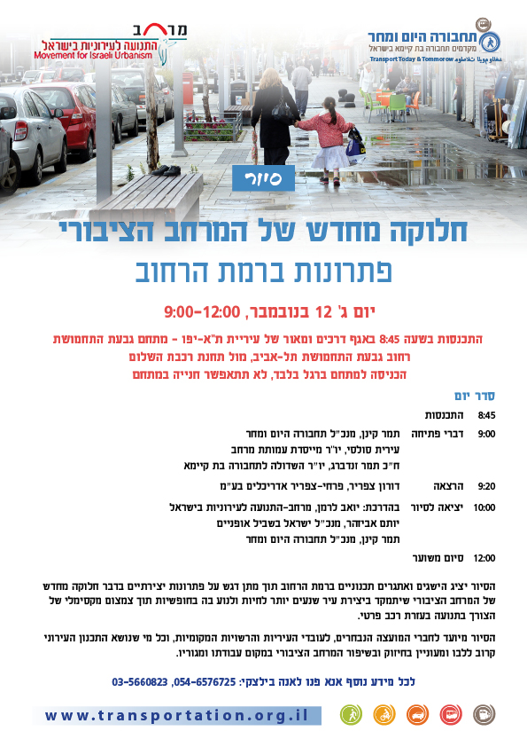 על מנת לקדם בברכה את חברי המועצות שייבחרו במסגרת הבחירות לרשויות המקומיות, תנועת "מרחב - התנועה לעירוניות מתחדשת" וארגון "תחבורה היום ומחר" תערוכנה ביום שלישי ה-.12.11.2013 סיור לחברי המועצה הנבחרים ולעובדי העיריות והרשויות המקומיות בנושא חלוקה מחדש של המרחב הציבורי- פתרונות ברמת הרחוב.